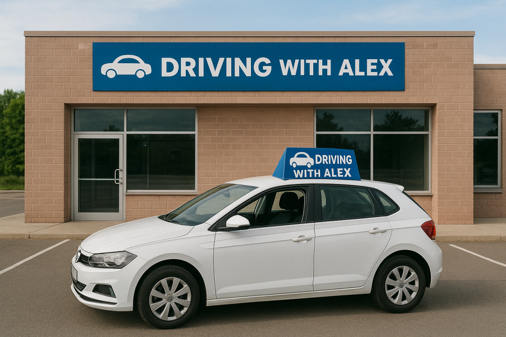 🏫 3. Auto davanti alla scuola – “Driving with Alex – La tua autoscuola di fiducia”Vista esterna della sede Driving with Alex: edificio moderno con insegna visibile, auto parcheggiata davanti con logo e segnalatore.Perfetta per la pagina contatti o chi siamo, mostra fisicamente la sede, trasmettendo affidabilità e presenza reale.