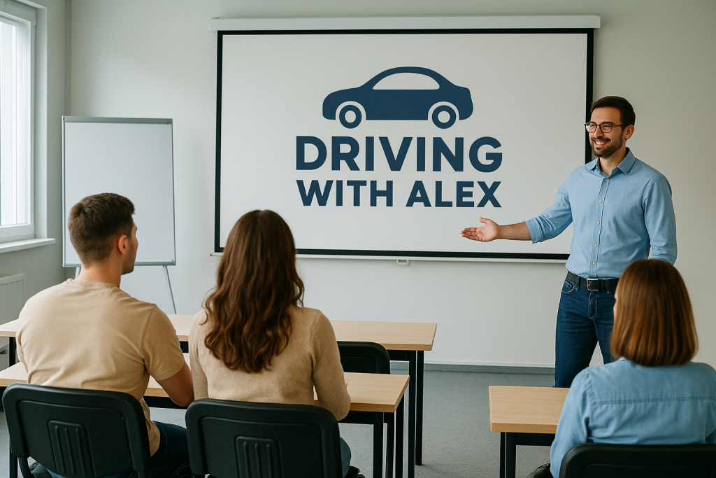 🧑🏫 Chi Siamo / Corsi di teoriaImmagine: 👉 La 1ª immagine (aula con istruttore)Uso: Sezione dedicata ai corsi teorici.Testo suggerito:> “Le nostre lezioni di teoria ti preparano a ogni domanda dell’esame. Aule moderne, materiali aggiornati e un approccio chiaro e pratico.” 🧑🏫 1. Aula teoria – “Driving with Alex – Lezioni di teoria interattive”Un’aula moderna, luminosa, con studenti seduti ai banchi e un istruttore davanti a una lavagna digitale che mostra il logo Driving with Alex.Perfetta per la home page o una sezione “Corsi di teoria”, trasmette professionalità e un ambiente di apprendimento accogliente.