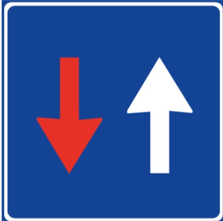 •In Presenza del segnale raffigurato posto sulla nostra corsia significa che abbiamo il diritto di precedenza nei sensi unici alternati , sta di fatto che tutti i veicoli provenienti dall’altro senso di marcia hanno l’obbligo di dare la precedenza . Di norma incontriamo il segnale nelle strade dove ce un cantiere stradale oppure corsia chiusa, è usato anche in prossimità alle strettoie nelle quali è istituito un senso unico alternato