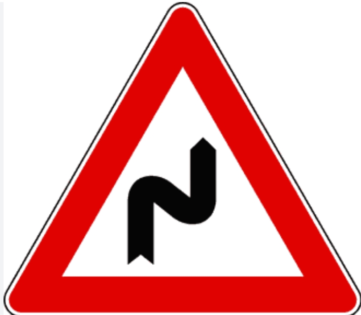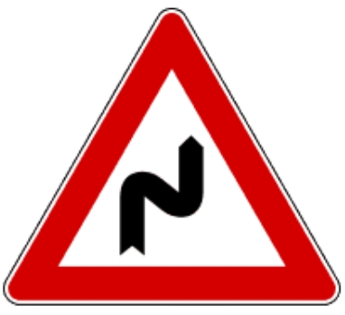 IL segnale raffigurato è una DOPPIA CURVA ,la prima a sinistra è un segnale di pericolo, questi segnali possono essere abbinato ad un pannello TORNANTE oppure con il pannello di estesa dove sarà riportata l’indicazione della lunghezza del tratto di strada interessato dalla serie di curve