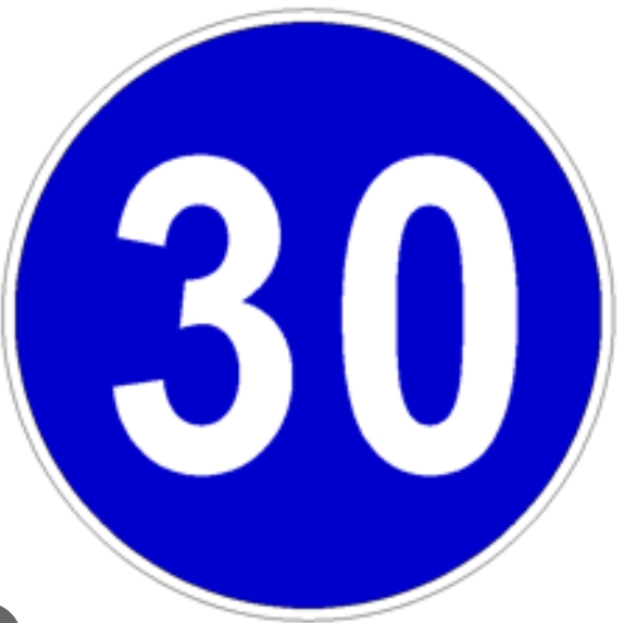 IL segnale raffigurato indica LIMITE MINIMO DI VELOCITÀ DI 30 KM/H cioè il limite di velocità al di sotto del quale è VIETATO scendere e quindi, OBBLIGA i veicoli a mantenere almeno la velocità minima indicata di 30 km/h. Attenzione da non confondere con il segnale del limite massimo di velocità!!