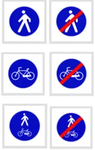 • PERCORSO PEDONALE, CICLABILE o UNICO: indicano delle aree adibite all’esclusivo transito di pedoni, o biciclette, o entrambi. La versione barrata indica la fine del percorso riservato alla categoria di utenti indicata nel cartello.