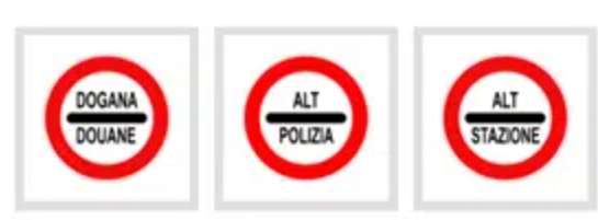 • ALT-DOGANA, ALT-POLIZIA, ALT-STAZIONE: unica eccezione per forma e colore, questi cartelli di obbligo indicano l’avvicinarsi di una stazione o di un posto di blocco e quindi l’obbligo di rallentare per essere pronti a fermarsi. I soggetti in questione sono la FRONTIERA DOGANALI, un posto di BLOCCO STRADALE della POLIZIA e le STAZIONI, o CASELLI, AUTOSTRADALI.