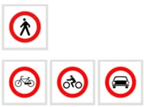 •DIVIETO di TRANSITO a una categoria specifica di utenti della strada: indica il divieto in quella strada. Nel caso dei pedoni, vieta alle persone a piedi di transitare, ma consente l’accesso resta consentito a tutti i veicoli, comprese le biciclette. Analogamente gli altri segnali vietano l’accesso a una categoria particolare di veicoli.
