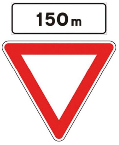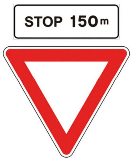•Il segnale di ‘preavviso di dare precedenza preannuncia la successiva presenza del segnale ‘dare precedenza’ e indica la distanza dall’incrocio in cui si deve dare precedenza sia a destra che a sinistra (nel caso dell’immagine di esempio a 150 m), invitando quindi a rallentare l’andatura per eventualmente fermarsi
